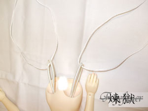 通常は、ゴム引きと言う道具があると便利ですが、サイズの違う人形によってゴム引きのサイズも変わるので結構面倒です。