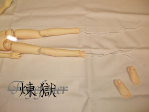 最後に紐ごとテンションゴムを頑張って引いて足(手/首)パーツに繋ぐだけ。 紐は案外なんでも使えるので結構重宝しています。